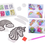 Vytvorte si 2 veľké dekorácie na postavenie alebo zavesenie a 12 trblietkových nálepiek s motívmi dúhy a jednorožcov. Perfektné na okná, zošity aj darčeky.