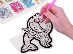 Všetko potrebné je vo vnútri balenia – 12 samolepiek, 2 veľké šablóny na postavenie či zavesenie, cca 1000 farebných kamienkov v 7 odtieňoch, prísavky s háčikmi, podstavce, triediaca tácka, vosk a aplikátor. Hotové dekorácie možno postaviť na stôl, zavesiť na okno alebo ozdobiť zošity a denníky.