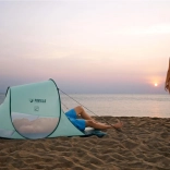 Dve okná a zadná sieťka zabezpečujú cirkuláciu vzduchu. Vrecká na piesok a kolíky udržia stan stabilný aj pri vetre.
