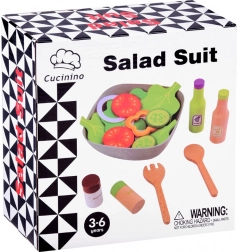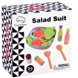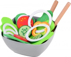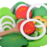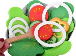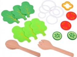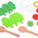 Textilné plátky zeleniny, drevené koreničky a servírovacie lyžice umožnia deťom pripraviť „pravý“ šalát a rozvíjať fantáziu v kuchynskej hre.