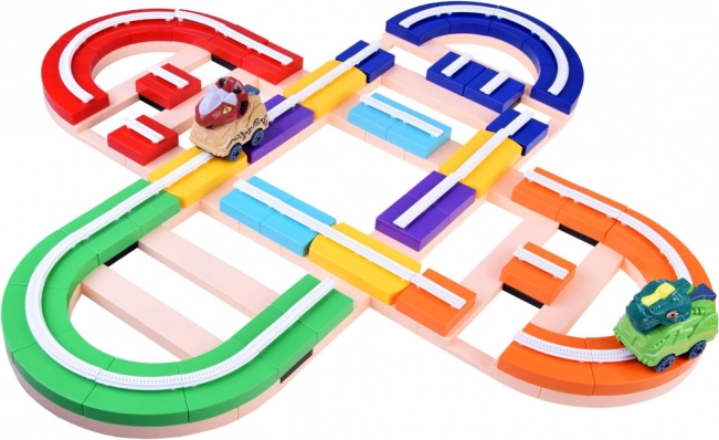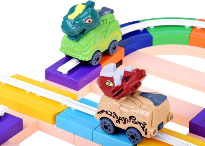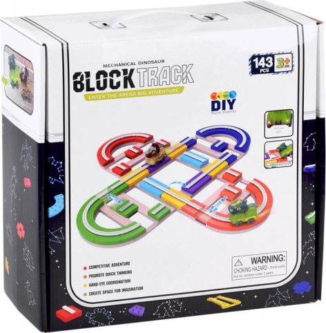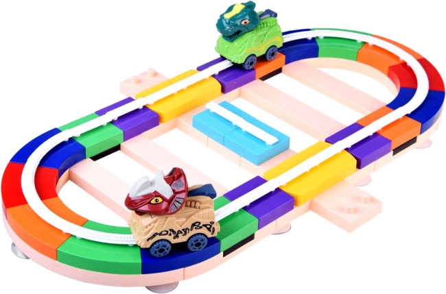 Stavebnica dráhy s dinosaurami prináša deťom možnosť skladať a prestavovať trasu podľa fantázie. Diely dráhy jednoducho zacvaknete do seba a môžete ich viesť po stole aj po stene – priložené prísavky držia na hladkých povrchoch, ako je sklo. Autíčka sa vďaka vedeniu v koľajniciach bezpečne pohybujú vodorovne aj zvisle a pri správnom natočení blokov možno ľahko meniť smer jazdy.