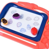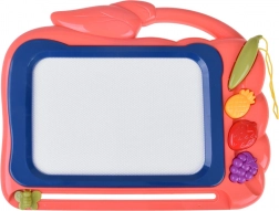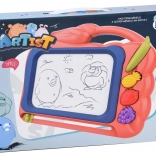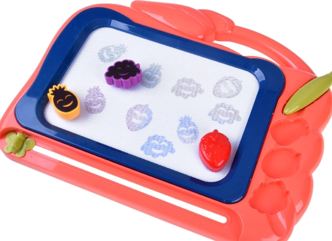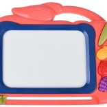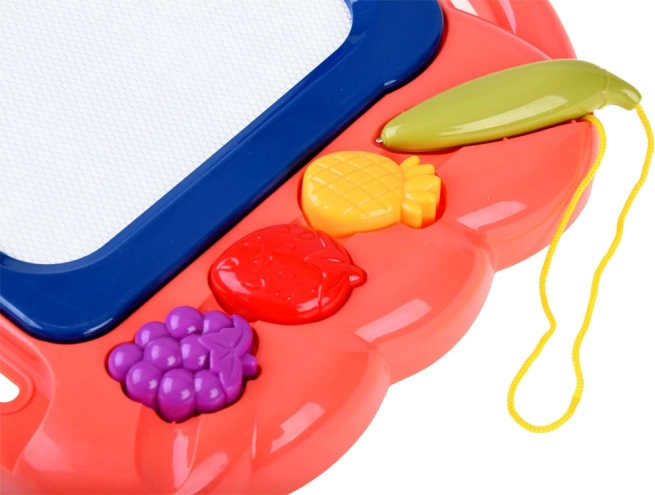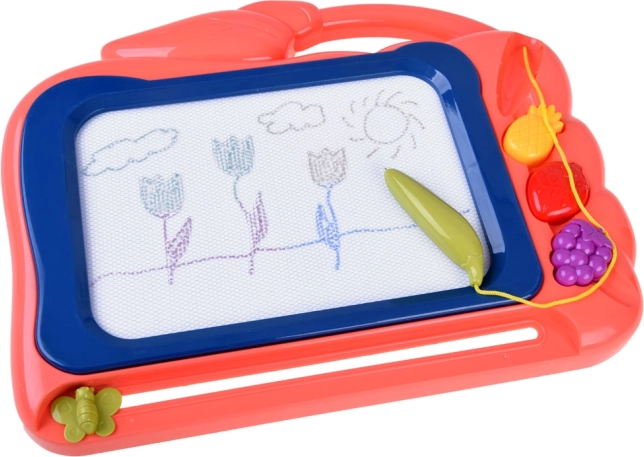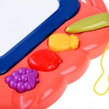 Táto kreatívna kresliaca tabuľka ponúka farebné pozadie, na ktorom deti ľahko vykúzlia obrázky pomocou priloženého pera. Tri pečiatky v tvare ovocia (ananás, jahoda a hrozno) dodajú každému výtvoru hravé detaily, rozvíjajú jemnú motoriku a podporujú radosť z tvorenia.