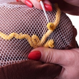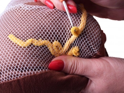 Vďaka sieťovanému vrecku a háčiku deti bezpečne prevliekajú priadzu a vytvárajú chlpatý povrch vankúšika bez šitia.