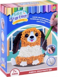- Hebký pom‑pom efekt, hnedo‑biely psík s filcovými doplnkami