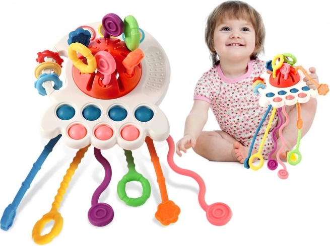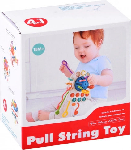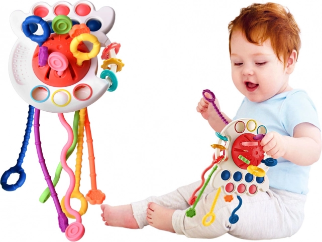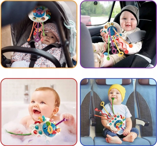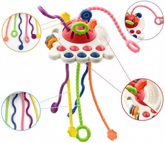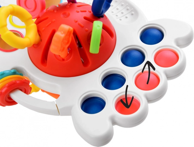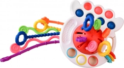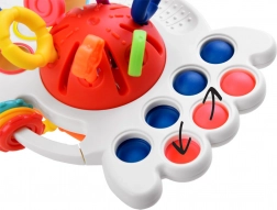 Hračka má mäkké senzomotorické tlačidlá, ktoré podporujú manipuláciu. Deti si môžu užívať rôzne dotykové podnety pomocou troch plastových krúžkov s rôznou textúrou a povrchom s výraznou textúrou guličiek.