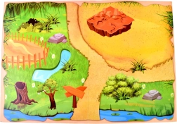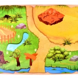 Herná podložka zahŕňa rôzne terény ako tráva, cestička a jazierko, ktoré obohacujú zážitky detí z hrania.