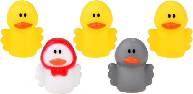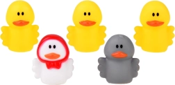 Sada obsahuje päť kačičiek: jednu bielu s červenou šatkou, jednu sivú a tri žlté.