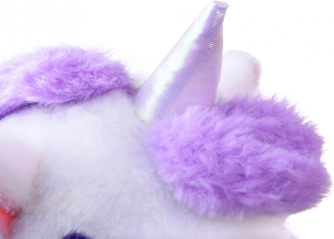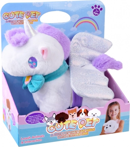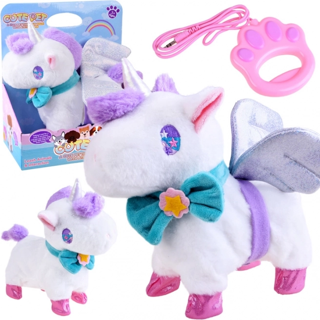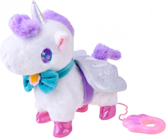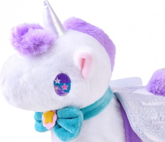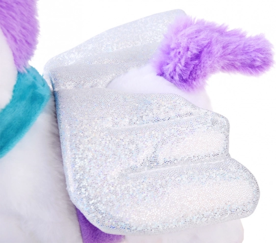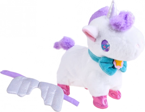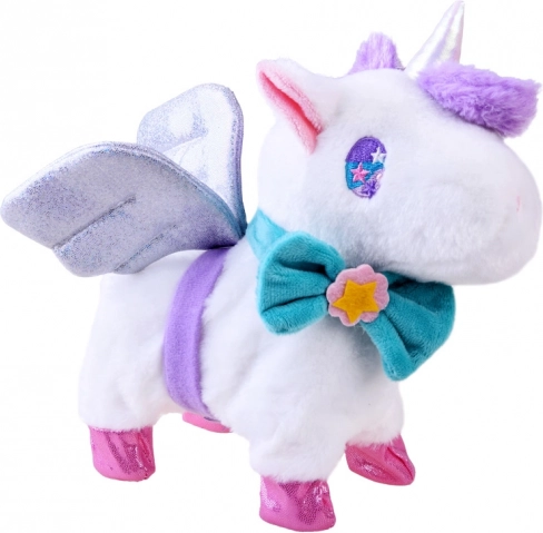 Interaktívny magický jednorožec je ideálnym darčekom pre každú malú princeznú. Tento plyšový, rozprávkový jednorožec poskytne deťom veľa radosti. Hračka je veľmi pekne spracovaná a príjemná na dotyk. Blikajúce krídla a tyrkysová mašľa sú odnímateľné. Jednorožec je poháňaný 3 batériami 1,5V AA, vďaka ktorým vie chodiť, kývať chvostom a revať. Počas chodenia vydáva zvuk cvalu. Jednorožec reaguje na dotyk, aktivuje funkcie hračky. Súčasťou balenia je vodítko na vedenie jednorožca. Po pripojení vodítka k jednorožcovej šiji a stlačení tlačidla aktivujete chôdzu a zvuky.
