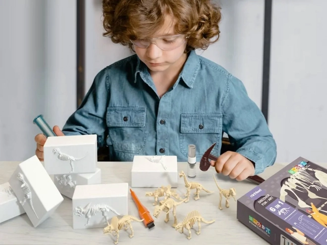 Objavte svet praveku s touto zábavno-náučnou sadou pre malých archeológov. Deti pomocou kladivka, dláta, štetca a rozprašovača jemne vyprostia zo sádrových blokov kostry 6 rôznych dinosaurov a zložia ich do modelov. Sada podporuje jemnú motoriku, logické myslenie a zvedavosť a vďaka ochranným okuliarom ponúka bezpečný a realistický paleontologický zážitok.