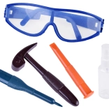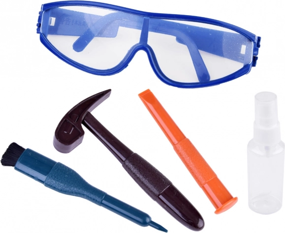 Dlátko, kladivko, štetec, rozprašovač a ochranné okuliare – kompletná výbava pre malých bádateľov, ktorá podporuje jemnú motoriku a koordináciu.