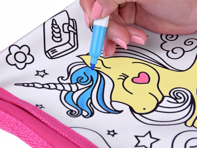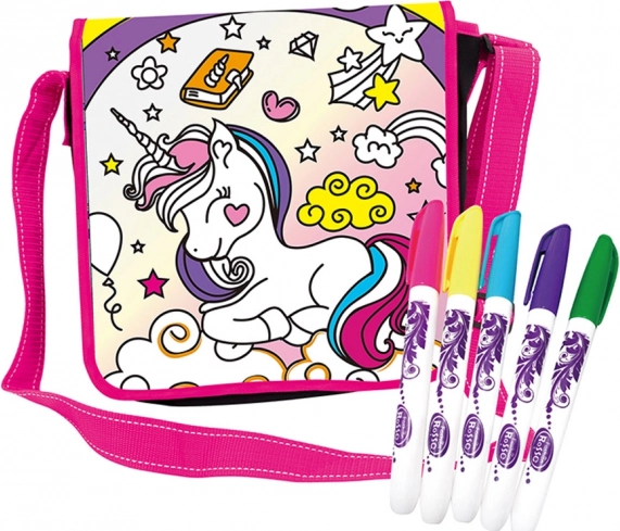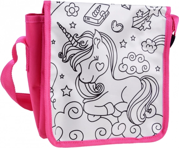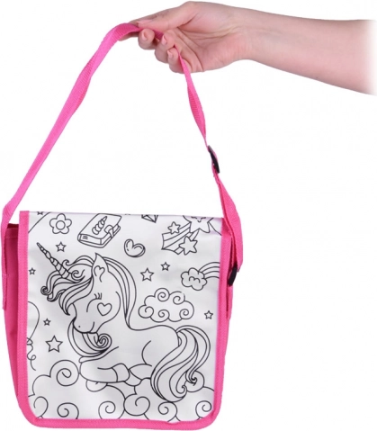 Kreatívna detská taška cez rameno s motívom jednorožca poteší malých umelcov od 6 rokov. Textilnú kabelku si deti môžu vyfarbiť priloženými fixkami (modrá, ružová, fialová, zelená, žltá) a po vypraní ju znovu a znovu vyfarbovať. Praktický nastaviteľný popruh, kompaktné rozmery 23 × 23 × 5 cm a rozkošný dizajn robia z tašky skvelý doplnok na každý deň.
