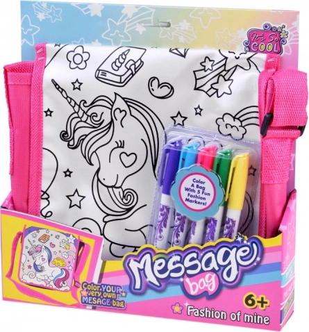 Súčasťou balenia sú farebné fixky s dĺžkou 14 cm (modrá, ružová, fialová, zelená, žltá), ktoré výborne kryjú a ľahko sa vymývajú. Taška s rozmermi 23 × 23 × 5 cm je ideálna na drobnosti do školy, na krúžky aj na výlety.