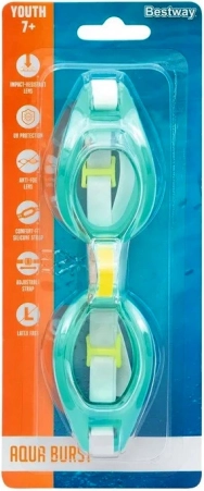 Detské okuliare Bestway Aqua Burst sú navrhnuté na prvé lekcie plávania aj každodenné vodné radovánky. Odolné šošovky z polykarbonátu chránia oči pred nárazmi a vďaka UV filtru aj pred ostrým slnkom. Úprava proti zahmlievaniu pomáha udržať jasný výhľad pod vodou.