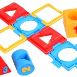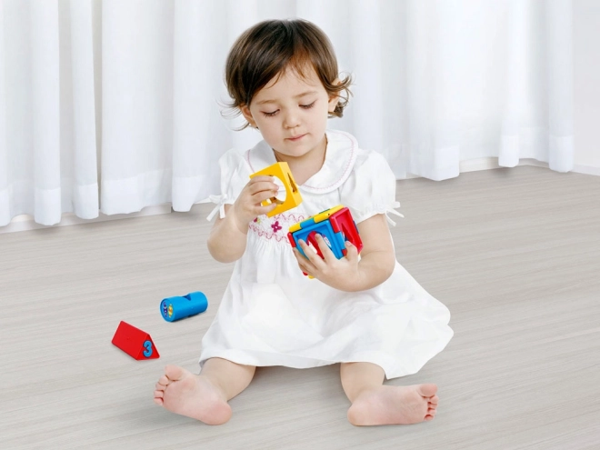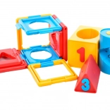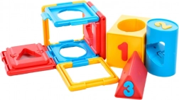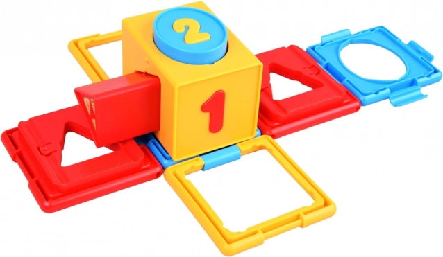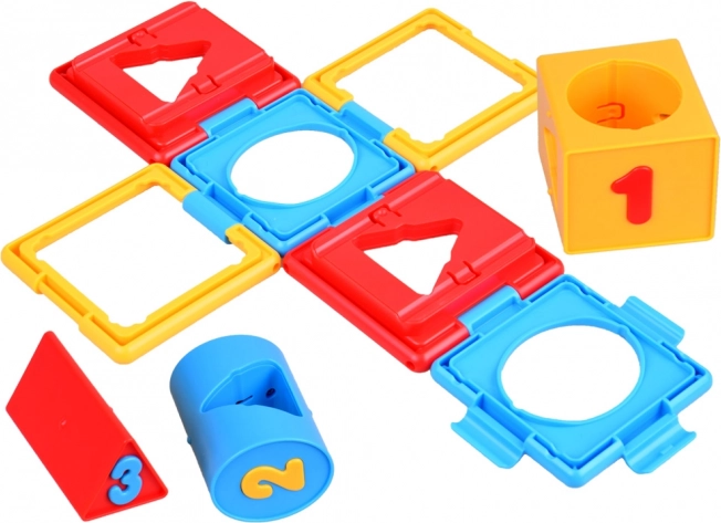 Kocka obsahuje rôzne tvary a čísla, čo pomáha pri učení základných tvarov a čísel.