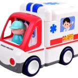Hlavné vlastnosti produktu: - Samostatná jazda: Vozidlo vie samo jazdiť a mení smer, keď narazí na prekážku. - Zvukové efekty: Obsahuje zvuky štartu motora, sirény záchranky, klaksónu, veselú hudbu a zvuk brzdenia. Svetelné efekty zahŕňajú blikajúce svetlá. - Funkčný prepínač: Pod vozidlom je prepínač na voľbu medzi statickým a pohyblivým režimom.