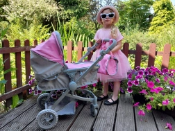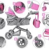 Pre maximálne pohodlie pri hraní je tu polohovateľná vanička, preklápacia rukoväť vpredu/vzadu a skladacia strieška. Dve predné otočné kolieska a plné kolesá EVA zabezpečujú hladkú jazdu doma aj vonku. Do priestranného košíka a priloženej tašky uložíte všetky doplnky pre bábiku.