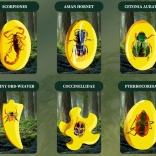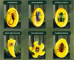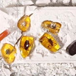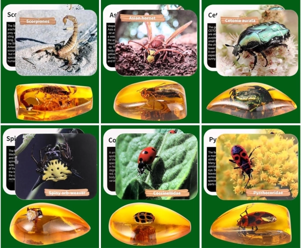 - sadrový odliatok so 6 „jantármi“, kladivko, dlátko, štetec, ochranné okuliare, lupa, vrecko na fosílie, stojanček, 6 kariet s hmyzom (EN)