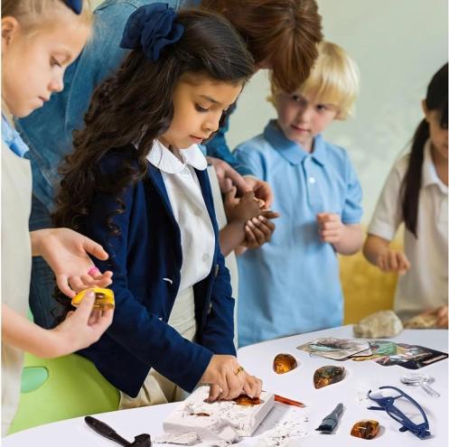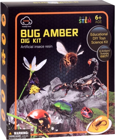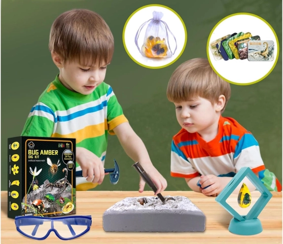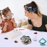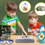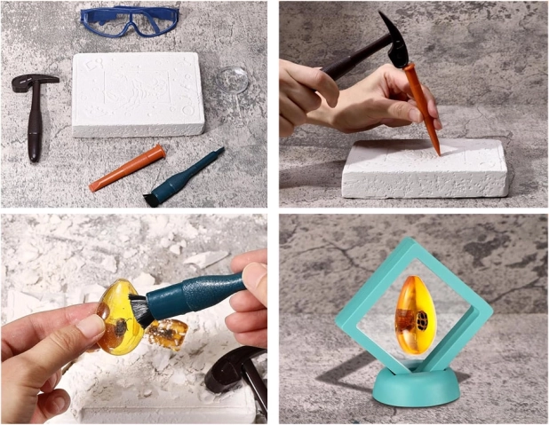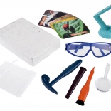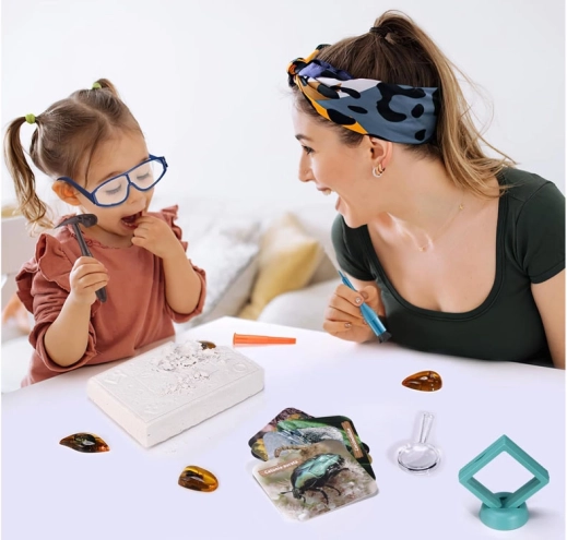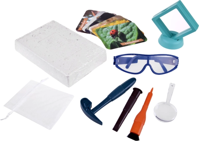Premeňte detskú izbu na malé paleontologické pracovisko. V sadrovom odliatku je ukrytých 6 „kusov jantáru“ so zataveným hmyzom, ktoré dieťa krok za krokom objaví pomocou kladivka, dlátka a štetca. Bezpečnosť zabezpečujú ochranné okuliare, na detailné skúmanie slúži lupa.