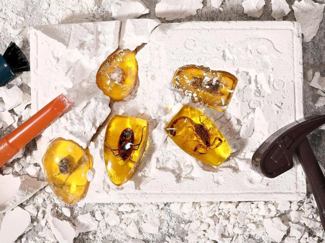 Sadrový blok ukrýva šesť „jantárov“ s hmyzom. Deti ich postupne objavia pomocou kladivka, dlátka a štetca – bezpečne a zábavne.