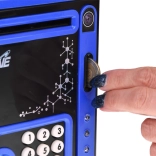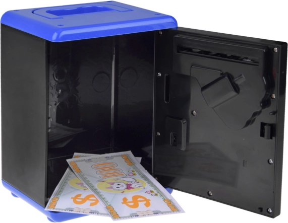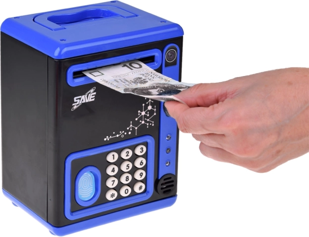- Funkcia učenia šetrenia: Vkladanie bankoviek do otvoru, ktorý ich automaticky vtiahne dnu, sprevádza veselá melódia.