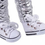 Mäkký ružový kožúšok, klapky na uši a strieborné nohavice dopĺňajú biele šnurovacie tenisky – ideálne na zimné dobrodružstvá vo fantázii.