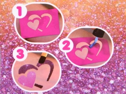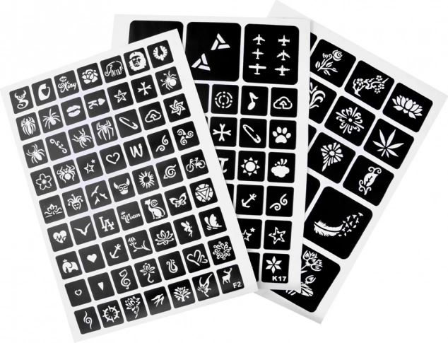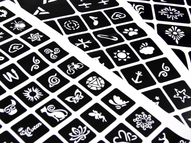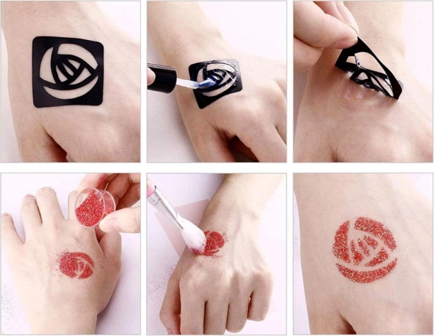 Návod: Vyberte šablónu a prilepte ju na čistú pokožku, naneste vzor lepidlom, odlepte šablónu, pridajte farby trblietok a je hotovo!