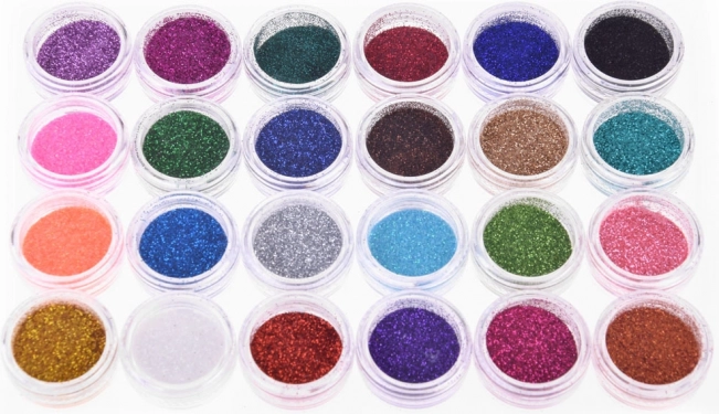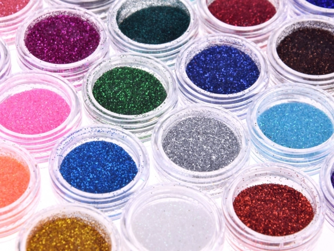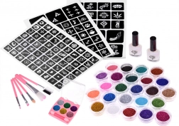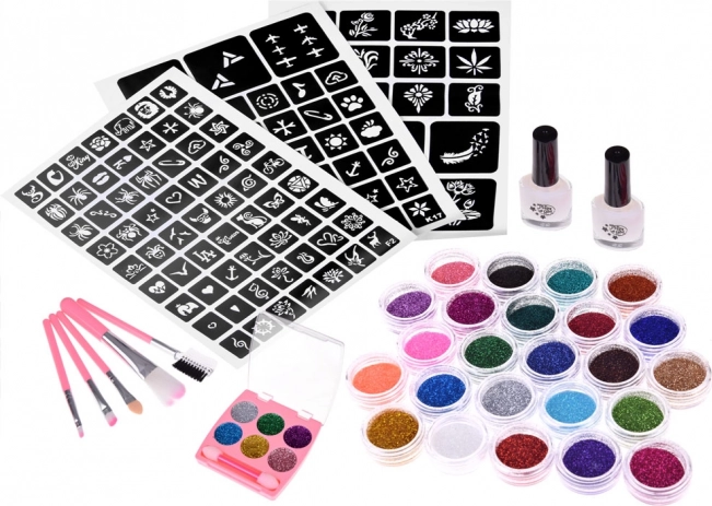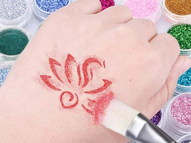 Set obsahuje všetko potrebné na tvorbu oslnivých trblietavých tetovaní s 24 rôznymi farbami trblietok.