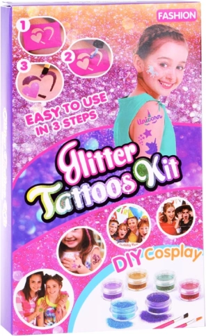 S touto sadou na trblietavé tetovania môžete okamžite vytvoriť úžasné trblietavé tetovania. Obsahuje 120 šablón rôznych veľkostí, 24 nádobiek s peknými trblietkami a 2 fľaštičky s lepidlom, čo vystačí na množstvo tetovaní. Súčasťou sú aj trblietavé očné tiene a sada štetcov na dokonalý styling vzhľadu.