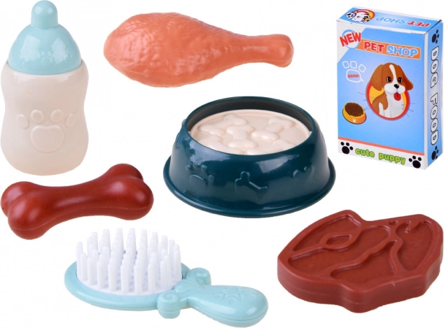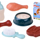 Súčasťou sady je miska s imitáciou krmiva, fľaša, kefa, kosť, kuracie stehno, steak, krabička s krmivom a samolepky – všetko pre realistickú starostlivosť.