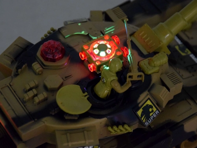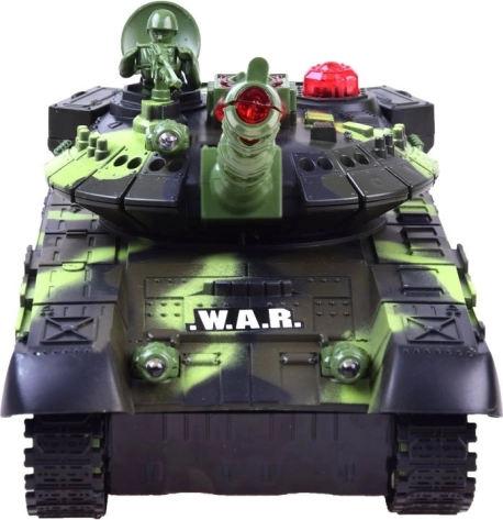 Tank je vybavený LED osvetlením (predné diódy, efektné svetlá veže) a zvukovými efektmi (motor, výstrel z dela, guľomet). Po troch zásahoch je protivník na cca 30 sekúnd vyradený z prevádzky a súboj môže začať odznova. Mäkké gumené pásy zabezpečujú dobrú priľnavosť a plynulý pohyb po rôznych povrchoch.