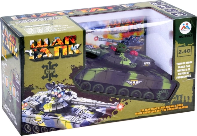 - Kompletná výbava v balení: RC tank, multifunkčný ovládač, USB nabíjačka, akumulátor do tanku, figúrka tankistu s guľometom.