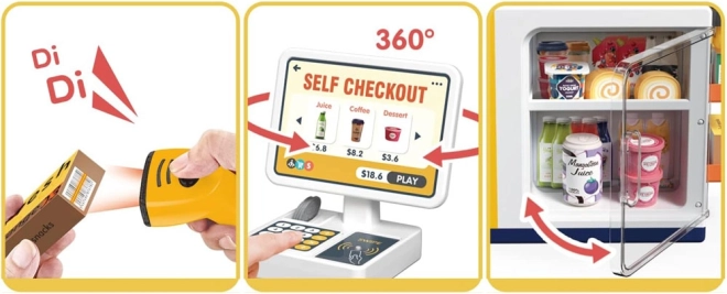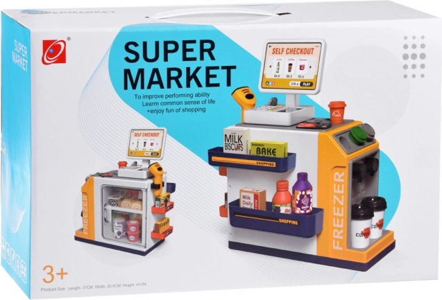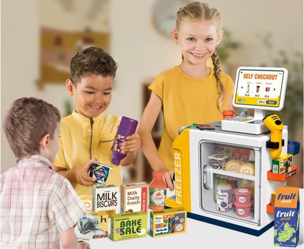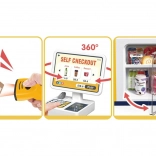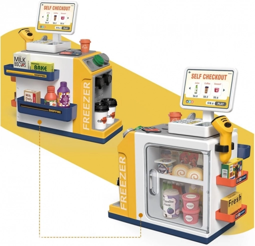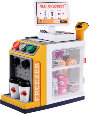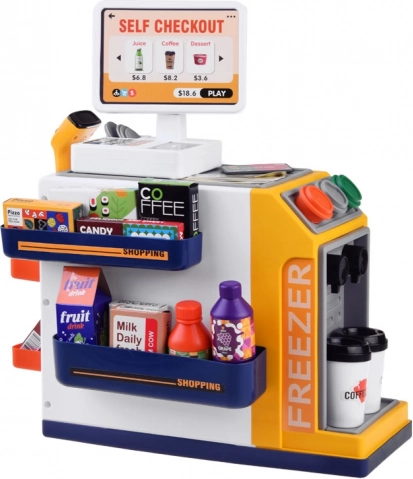 Táto realistická samoobslužná pokladňa s kávovým kútikom premení izbu na malý supermarket. Deti si vyskúšajú obsluhu zákazníkov, prípravu kávy, skenovanie tovaru a platenie kartou aj „v hotovosti“. Integrovaná mraznička/chladnička na dezerty a nápoje, farebné tlačidlá a displej vytvárajú autentický zážitok.