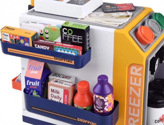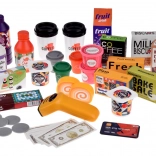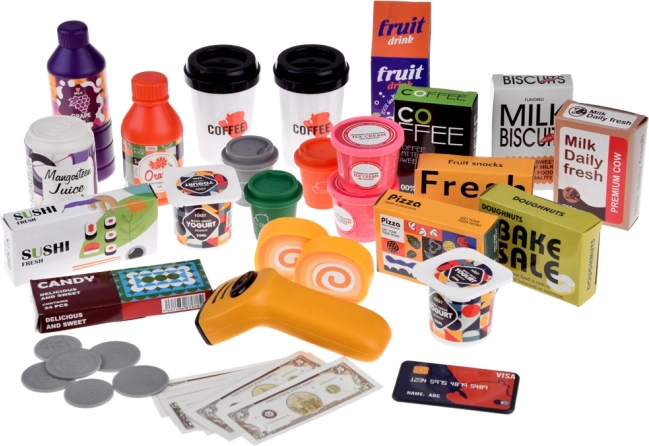 Kelímky na kávu a espresso, bankovky, mince, kreditná karta aj rôzne nápoje a krabičky s tovarom – všetko pre kreatívny role-play a rozvoj fantázie.