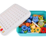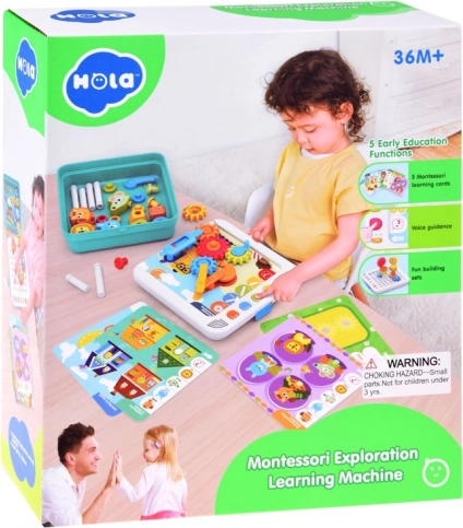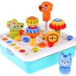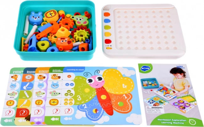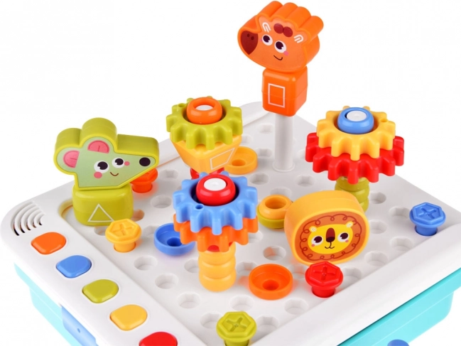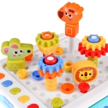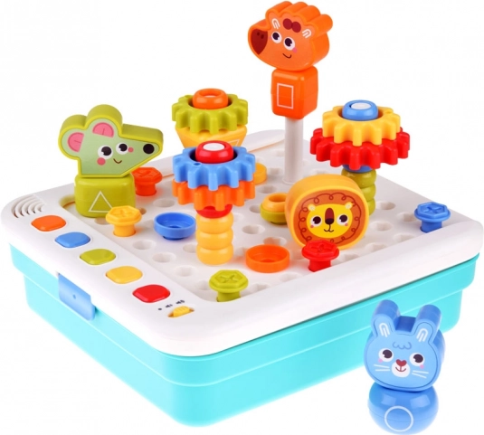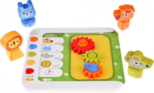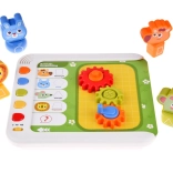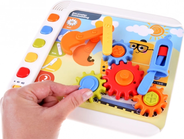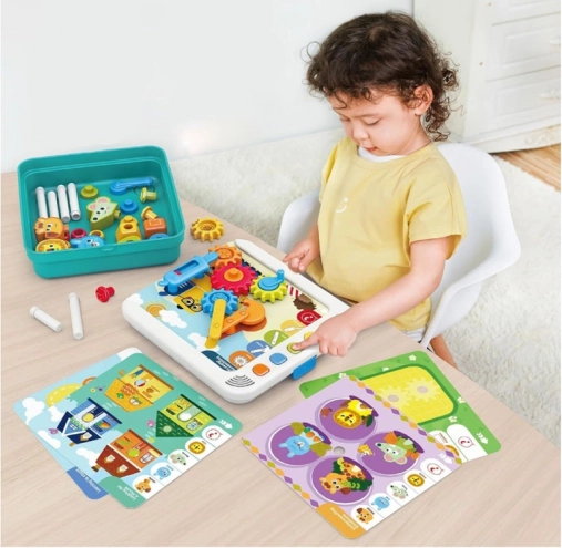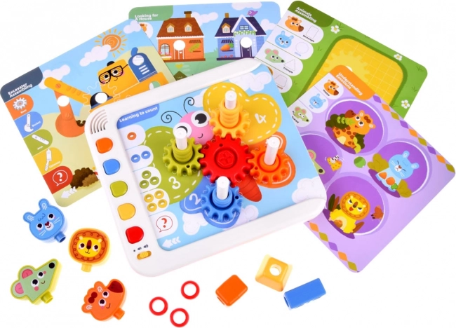 Súčasťou je elektronický panel, zásuvka na dieliky, 5 tematických kariet, farebné kocky a ozubené kolieska, figúrky zvierat (žirafa, králik, myška, lev) a farebná ilustrovaná knižočka. Dieťa môže stavať pohyblivé konštrukcie, rozvíjať koordináciu oko–ruka a chápanie mechaniky prevodov. Červené tlačidlo na paneli spúšťa dodatočné výzvy pre ďalšiu zábavu.