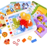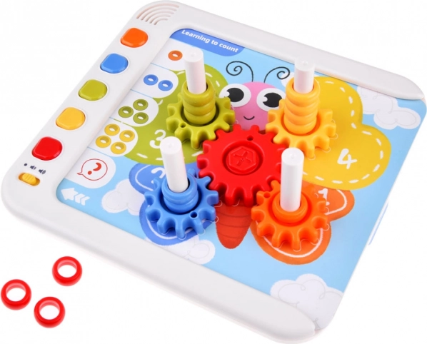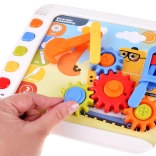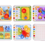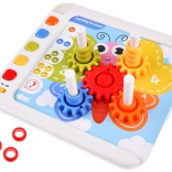 Farebné kolieska a kocky rozvíjajú jemnú motoriku aj chápanie mechaniky. Otáčaním jedného kolesa sa dávajú do pohybu ostatné – zábava, ktorá učí príčinu a následok.