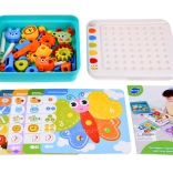 Karta s motýlikom učí deti počítať nasúvaním korálikov na kolíky podľa inštrukcií. Správne odpovede panel potvrdí, nesprávne povzbudí k opakovaniu.