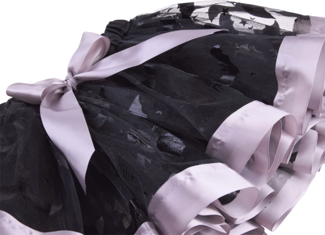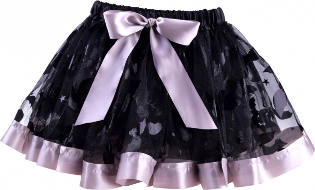 Čierna sieťovaná sukňa s dekoratívnymi vzormi, fialovým lemom a mašľou. Elastický pás zaistí pohodlie a jednoduché obliekanie.