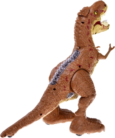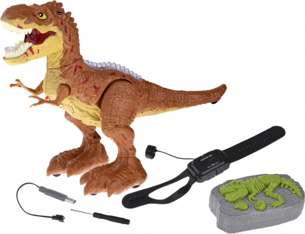 Model je spracovaný s dôrazom na realistické detaily, má svetelné prvky na chrbte a červeno podsvietenú papuľu. V balení nájdete všetko potrebné: RC ovládač, senzorový náramok, akumulátor 3,7 V 500 mAh, USB nabíjačku, skrutkovač aj kvapkadlo na doplnenie vody pre parný efekt.