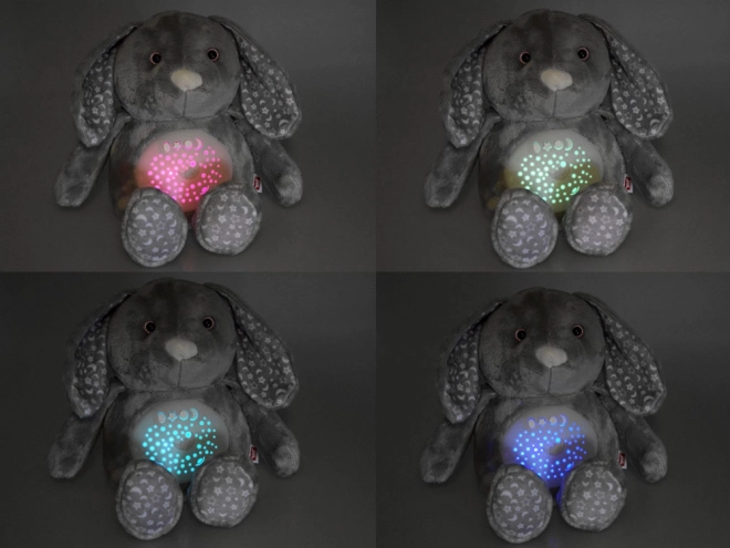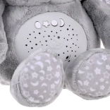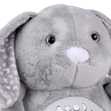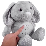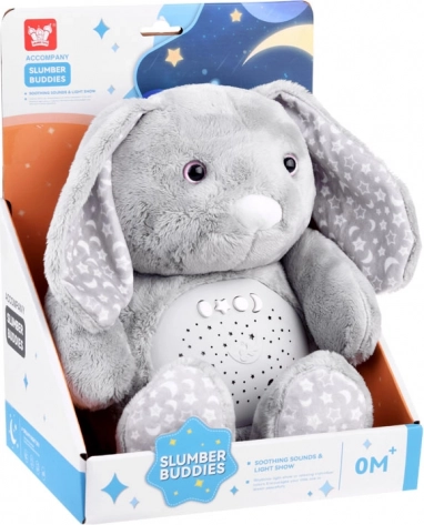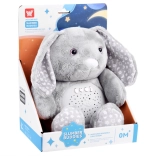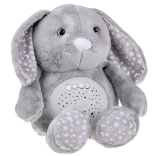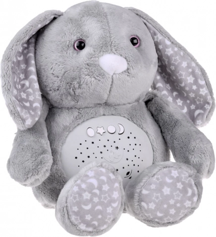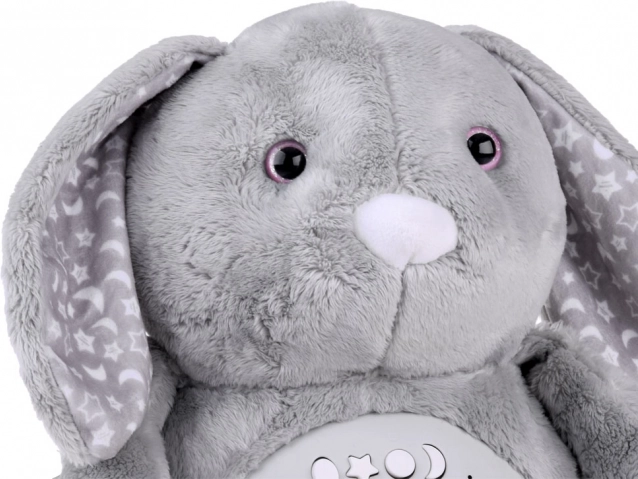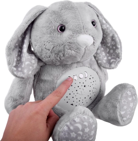 Tento mäkučký plyšový zajačik je vyrobený z jemného materiálu v tlmenej sivej farbe, zdobený vzormi hviezd a mesiaca na ušiach a nohách. Oči sú vyrobené z plastu, zatiaľ čo nos je vyšitý, čo dodáva hračke roztomilý vzhľad. Vďaka interaktívnemu panelu umiestnenému v brušku zajačika sa stáva nepostrádateľným spoločníkom pre deti, ktoré majú problémy so samostatným zaspávaním.