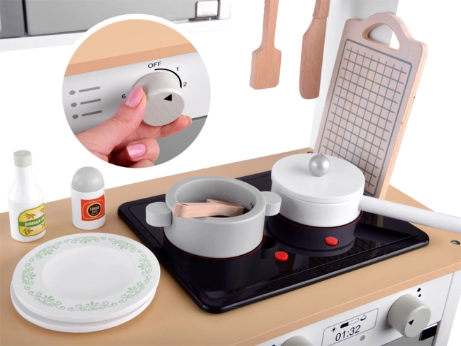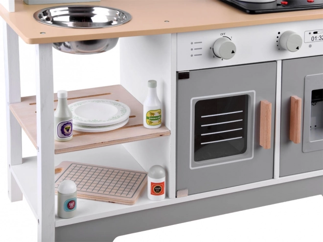 Drevená interaktívna kuchynka je ideálnym nástrojom pre rozvoj kreativity a motorických zručností vašich detí. Tento detský set napodobňuje každodenné činnosti, podporuje imaginatívnu hru a je kompletne vyrobený z prírodného dreva, čím zaisťuje bezpečnosť a odolnosť.
