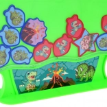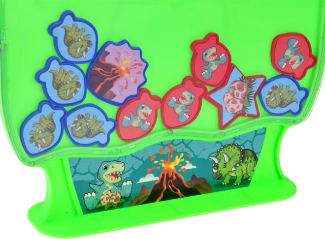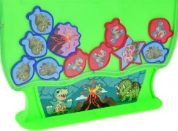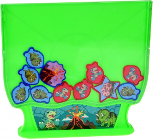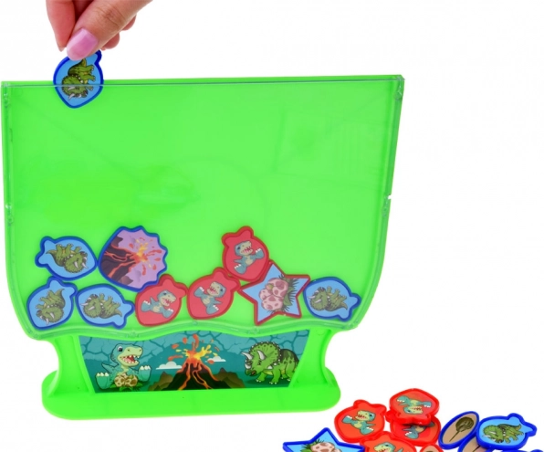 Pevná plastová „klietka“ s motívom dinosaurov a sopky je hlavnou scénou hry. Vhodené žetóny sa bezpečne usadzujú vo vnútri, takže je hra prehľadná, rýchla a bez zbytočného neporiadku.