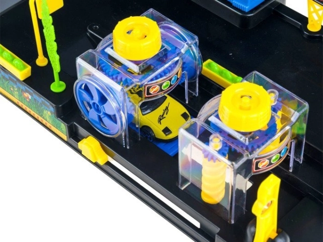 Deti môžu svoje vozidlá dôkladne „umývať“ v farebnej umývačke s kefami a prejazdnými stanovišťami – zábava aj rozvoj koordinácie.