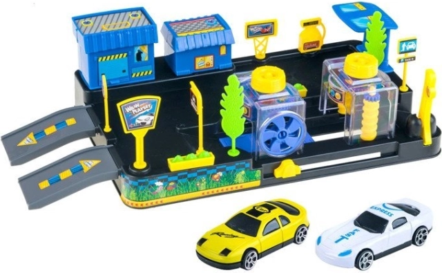 Súčasťou sú 2 športové autíčka (odosielané náhodne), pripravené ihneď na jazdu umývačkou a po rampách.
