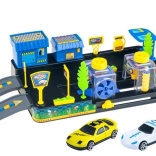 - 2 športové autíčka (náhodný výber), diely umývačky a čerpacej stanice, diely budov, nálepky, návod