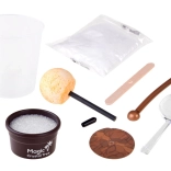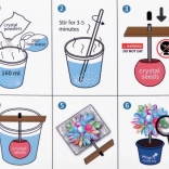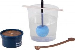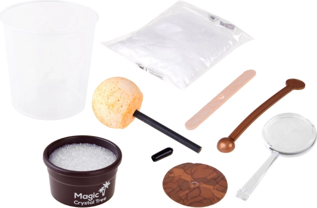 V sade nájdete všetko potrebné: odmerný valec 200 ml, sáčok s kryštálovým práškom/pieskom, farebné kryštálové semienko na tyčinke, miešadlo, lupu na detailné pozorovanie, drevenú doštičku, zarážku a malý kvetináčik (podstavec). Postup je jednoduchý a bezpečný, stačí dodržať návod a pracovať s horúcou vodou pod dohľadom dospelej osoby.