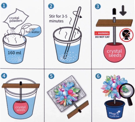 Tento vzdelávací STEM experiment umožní deťom sledovať skutočný proces kryštalizácie – od prípravy roztoku až po rast nádhernej kryštálovej koruny. Počas niekoľkých dní vznikne originálny kryštálový stromček, ktorý sa stane efektnou ozdobou izby a pripomienkou prvého vedeckého pokusu.