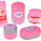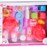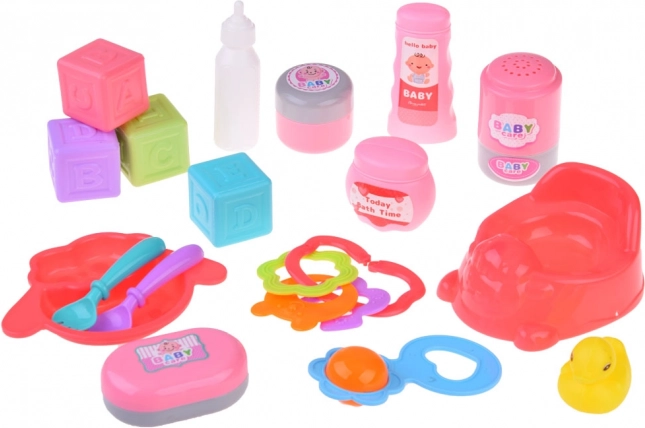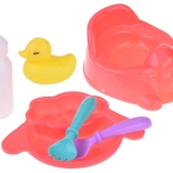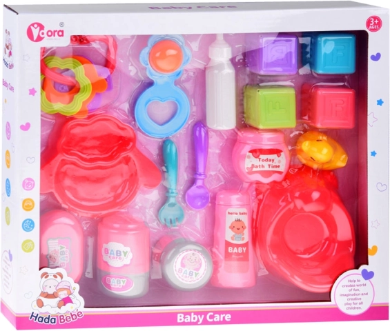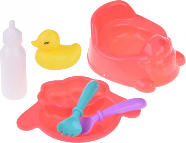 Táto sada detských hračiek ponúka všetko, čo malá mamička potrebuje pre starostlivosť o svoje bábiky. Obsahuje základné nástroje pre role-playing, ako je nočník, tanierik s lyžičkou a vidličkou, a tiež rôzne fľaštičky a kačičku na kúpanie. Každá z týchto rekvizít je navrhnutá tak, aby podporovala predstavivosť a motoriku detí.