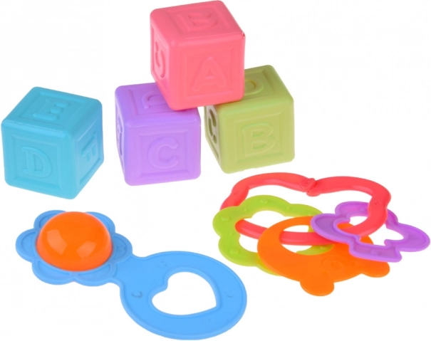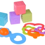 Sada obsahuje prvky, ktoré pomáhajú pri rozvoji jemnej motoriky a koordinácii oka a ruky, ako sú farebné kačičky a rôzne hračky na stavbu.
