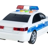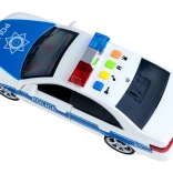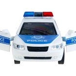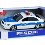 Realistické policajné auto s detailmi ako modré a červené svetlá a nápisy 'POLICE'.