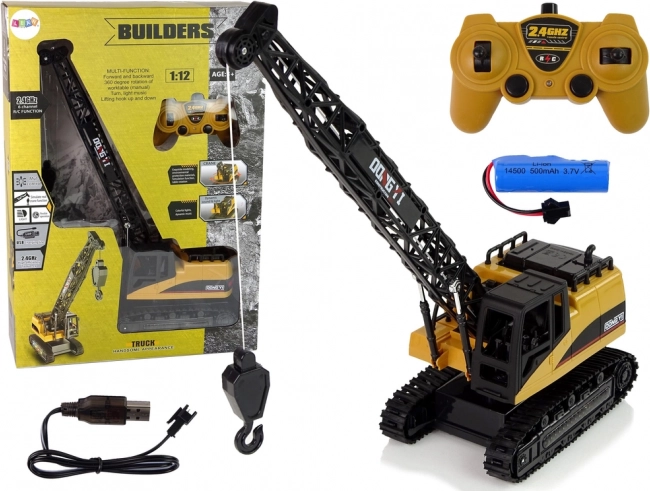 Žeriav je ovládaný diaľkovým ovládačom pracujúcim na frekvencii 2,4 GHz pre stabilitu a presnosť.